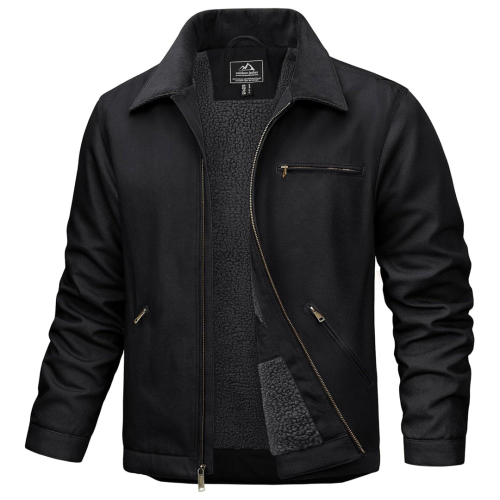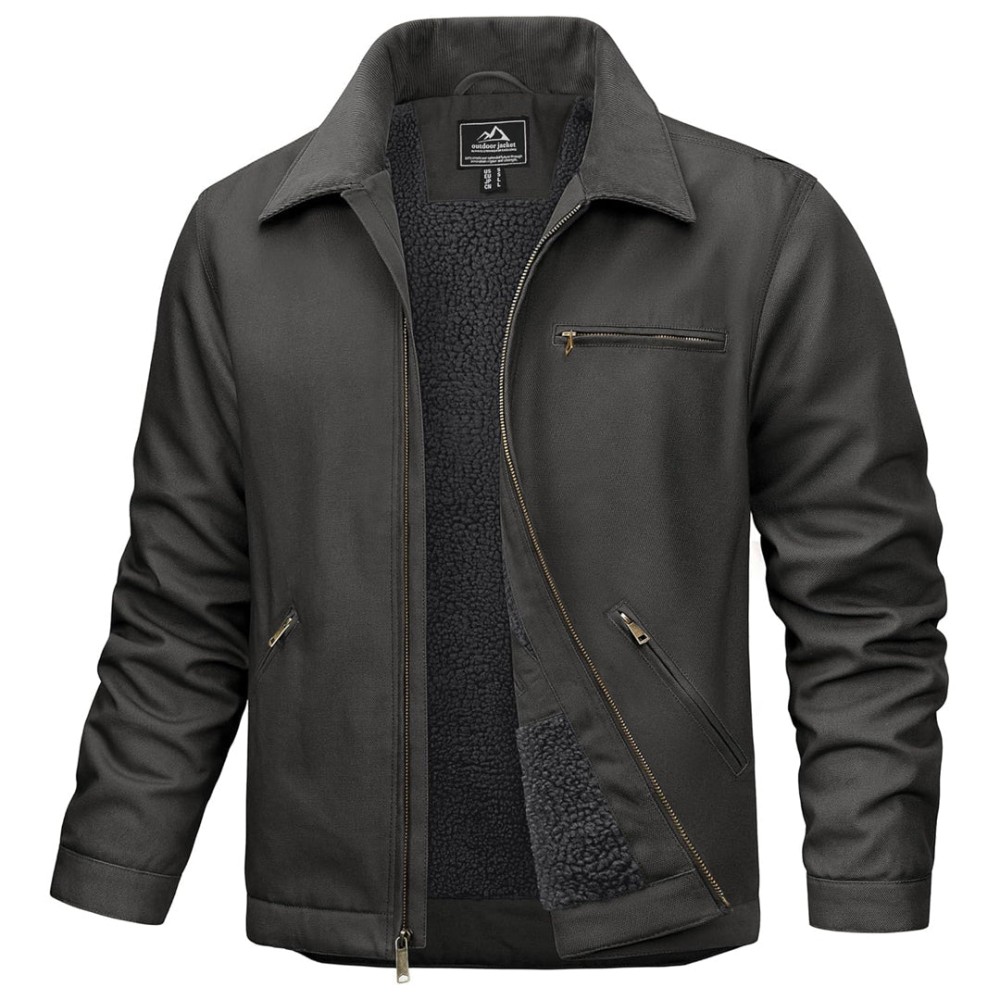 Full zip front, classic turn-down collar, snap-adjustable cuffs, thickened lining for winter warmth.